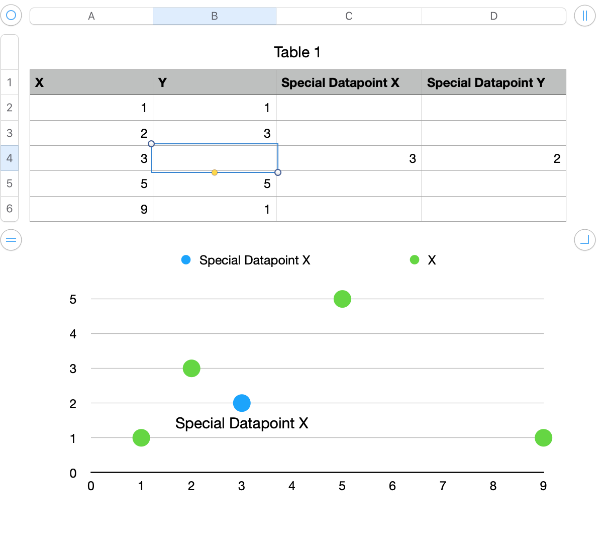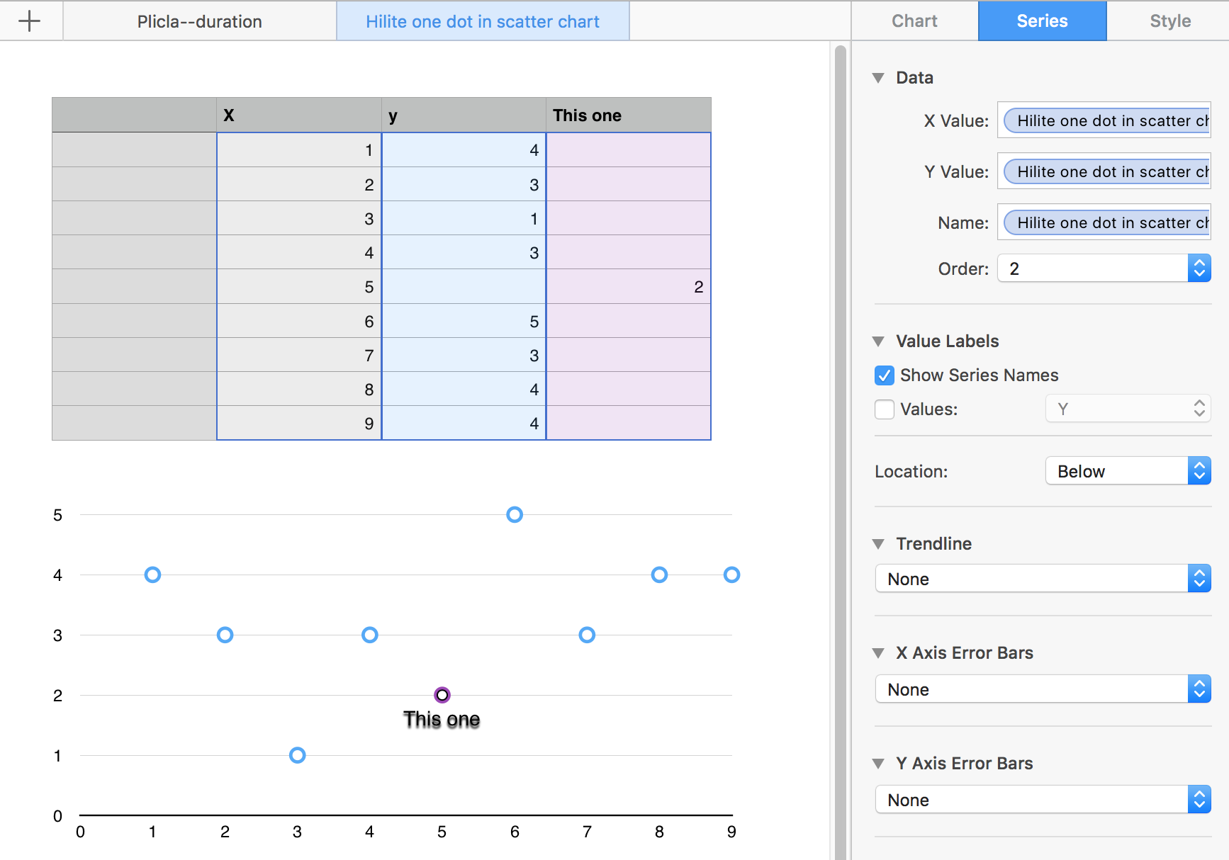 PS: The top three entries in the inspector were placed there by Numbers. I haven't investigated further, but you might explore and find that the 'extra column' holding the single point to be highlighted might not be necessary.