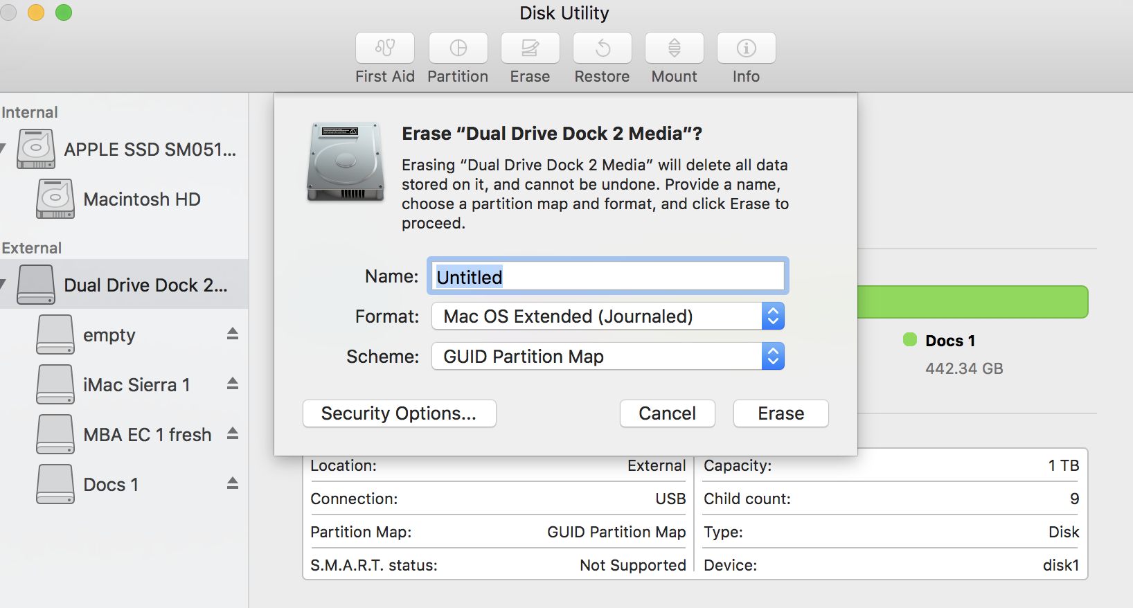 Plug in the external hard drive. Launch Disk Utility (Applications folder > Utilities) and highlight the top entry of the external drive in the left column. Go to "erase"and choose what it shows in my screenshot - also name it whatever you like such as "iMac backup". When done, you should see an icon for it on your desktop.