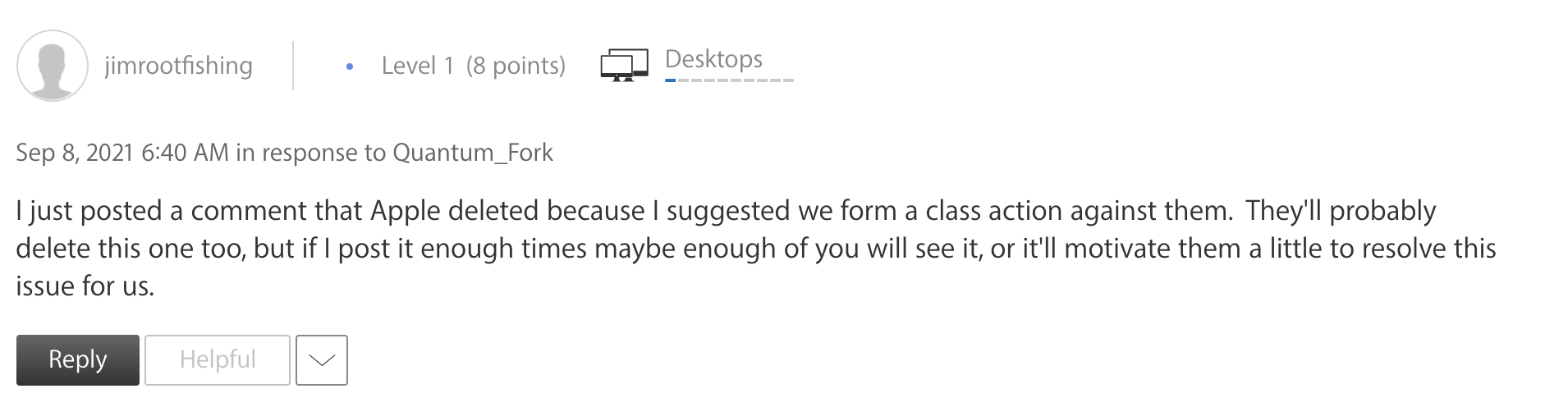 So, that would be cool, if they were going to accept responsibility, but they're not. My machine is out of warranty, so to fix it I have to pay for it. There has never been a hardware issue with my camera in any of the diagnostic tests that were done previously, and my camera worked fine without any issue prior to the Big Sur update in March. I'm so angry right now that I'm beyond words. I will never, ever buy another apple product. Since 2012 when I made the switch to apple I've purchased 15 iPhones, 5 iPads, 4 iMacs, and 2 MacBooks. I'm shopping for a new machine, and when my contract is up a new phone for everyone in my house and business. I've never seen such blatant disregard for consumer loyalty. The proof of Apple's responsibility is crystal clear in the radio silence from them in this thread. Find any other thread here with a technical issue and you'll see an Apple rep respond within 3 or 4 comments. But not here.