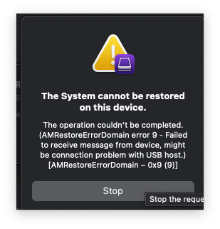 BUT, neither reviving or restoring is working!!! every time I try it goes to the same mode, the apple logo shows up, loading goes to the very end (doesn't fill, its filled from the beginning), then I get an AMRestoreErrorDomain error 9. and then it goes to the same mode with the fans at max speed and backlight turned on.