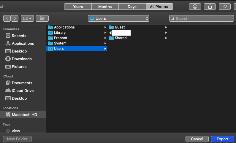 And export them to the folder created in finder https://support.apple.com/en-in/guide/photos/pht6e157c5f/mac