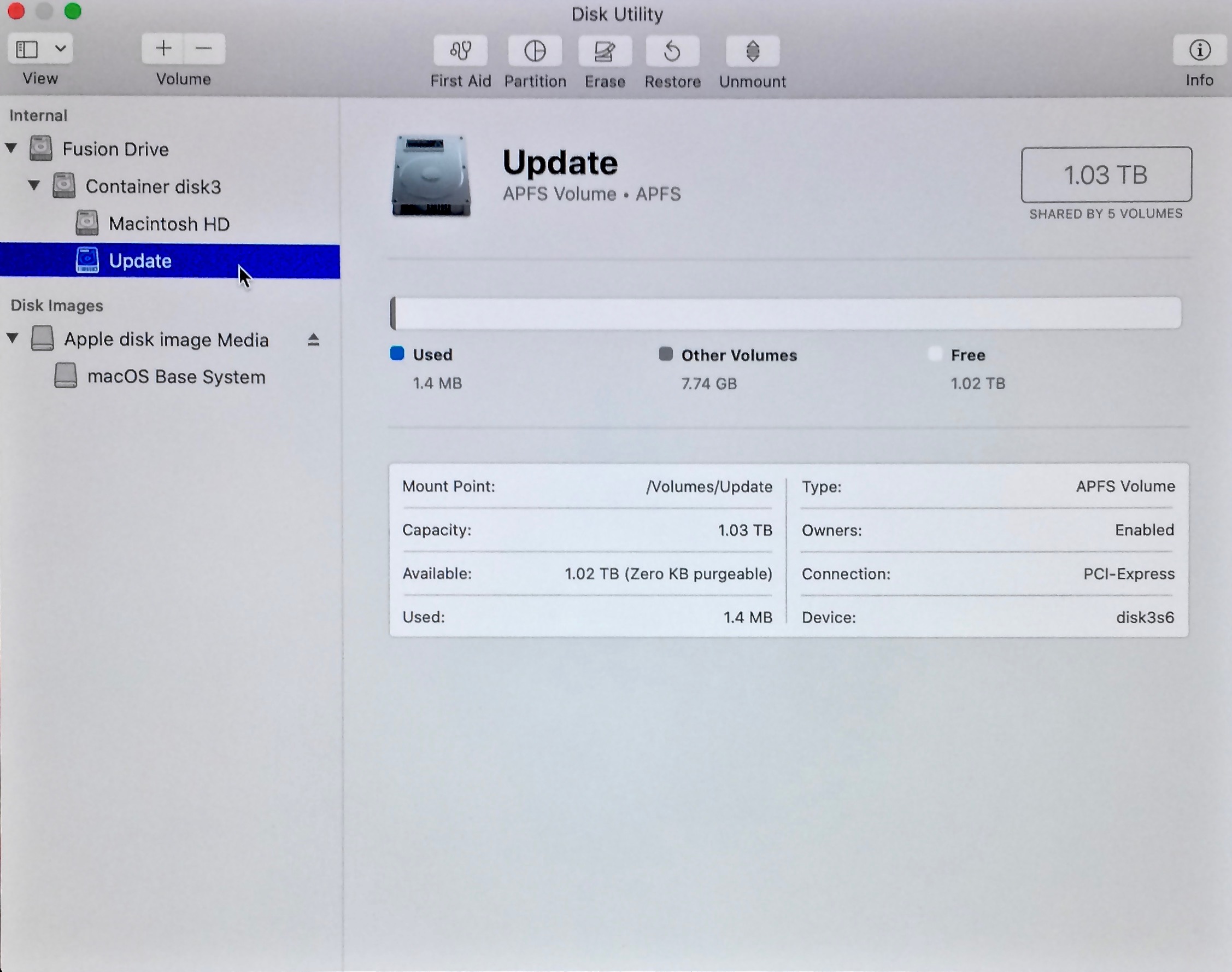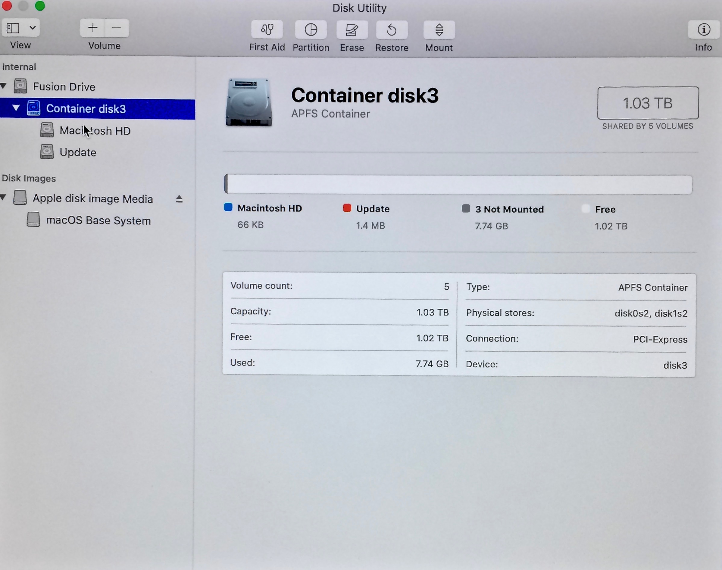 • According to Disk utility the 1 TB of space is shared by 5 volumes. 3 of which are not mounted and take up 7.74 GB. I am not sure what those 3 are, even after running diskutil list.
