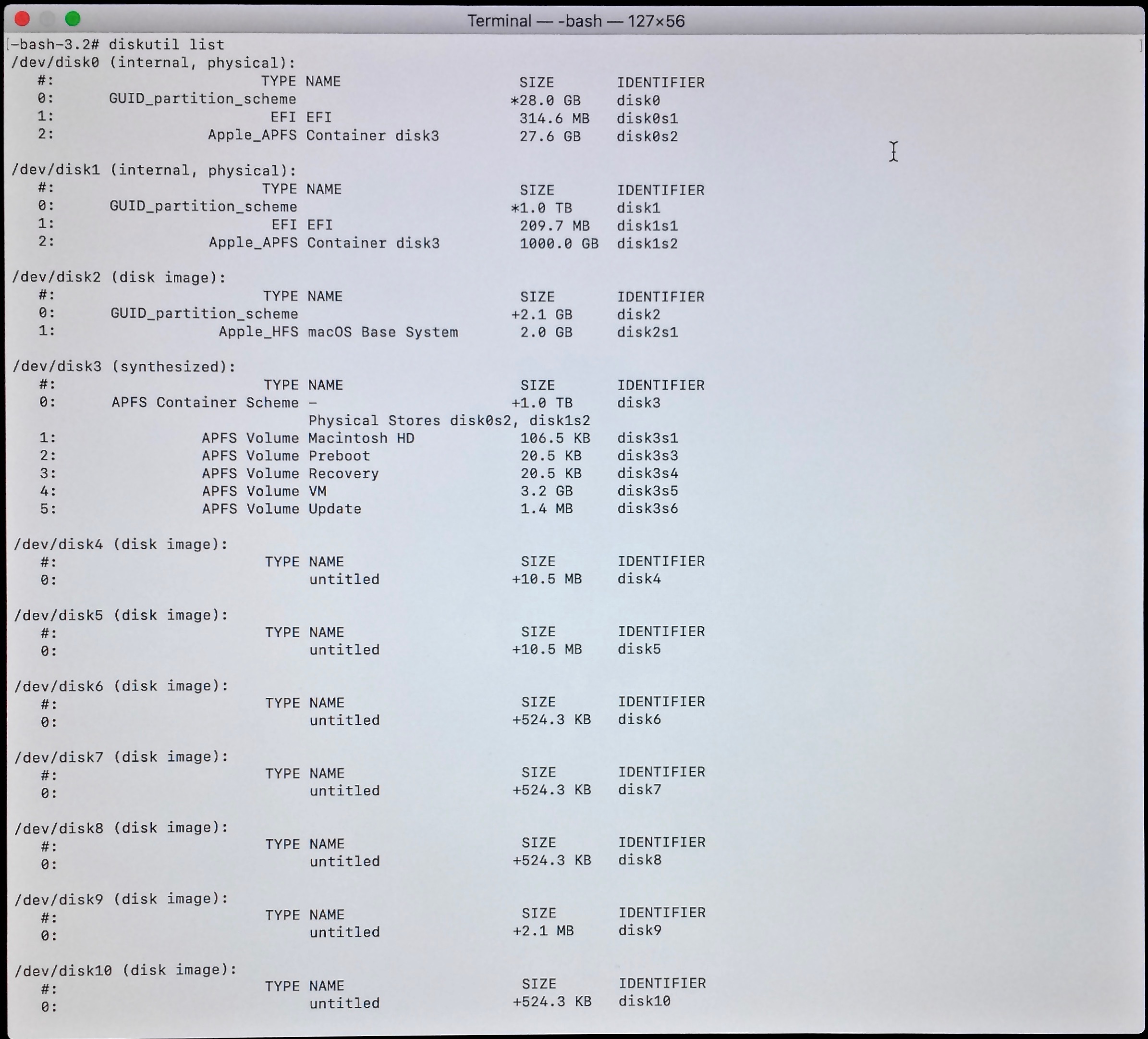 • When I ran diskutil list in terminal it listed 24 disks/disk images. Twenty-four. Aside from disk0 - disk3 – which have identifying info that makes sense (for the most part) – there are an additional 20 "untitled" mystery disk images. They're all of varying small sizes, from 524.3 KB to 12.6 MB.