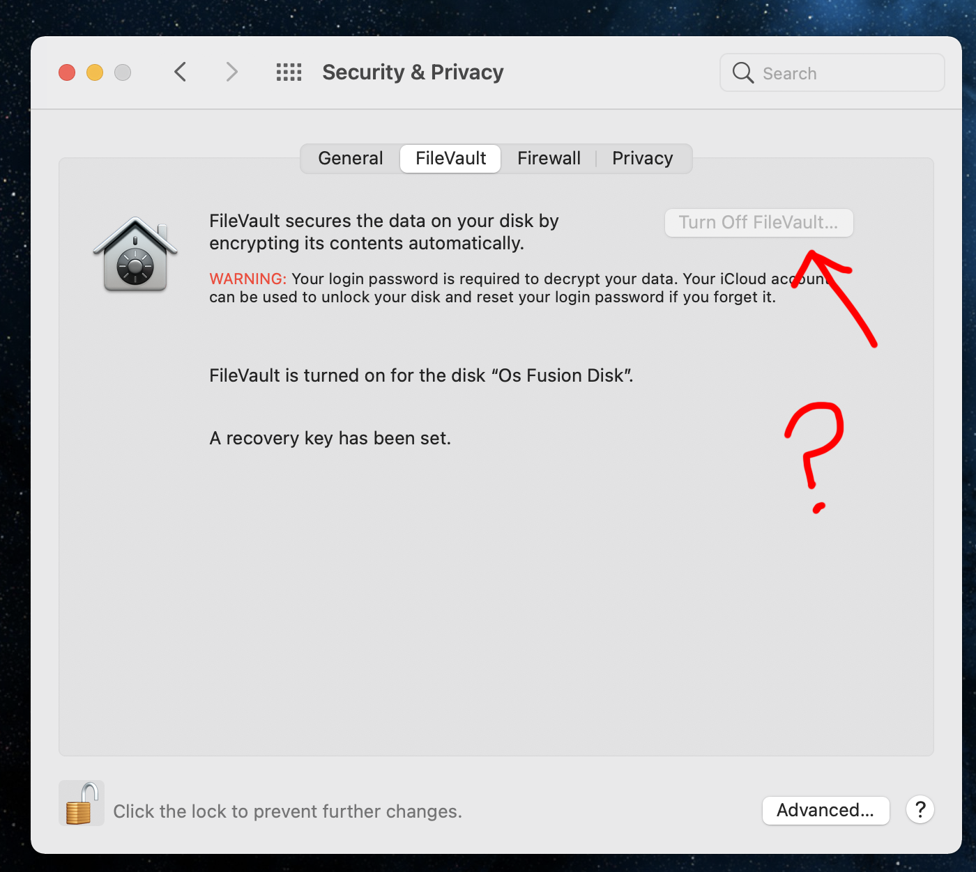 Don't know why I chose to turn it on. Now Time Machine won't backup "until my OS disk is encrypted". It is taking days (if it is doing something!) and I have no way to check how long it will last (Again.. if it is really encrypting it). I am the ADMIN and sole user of the computer... but Turn Off option is frayed out. Any idea?