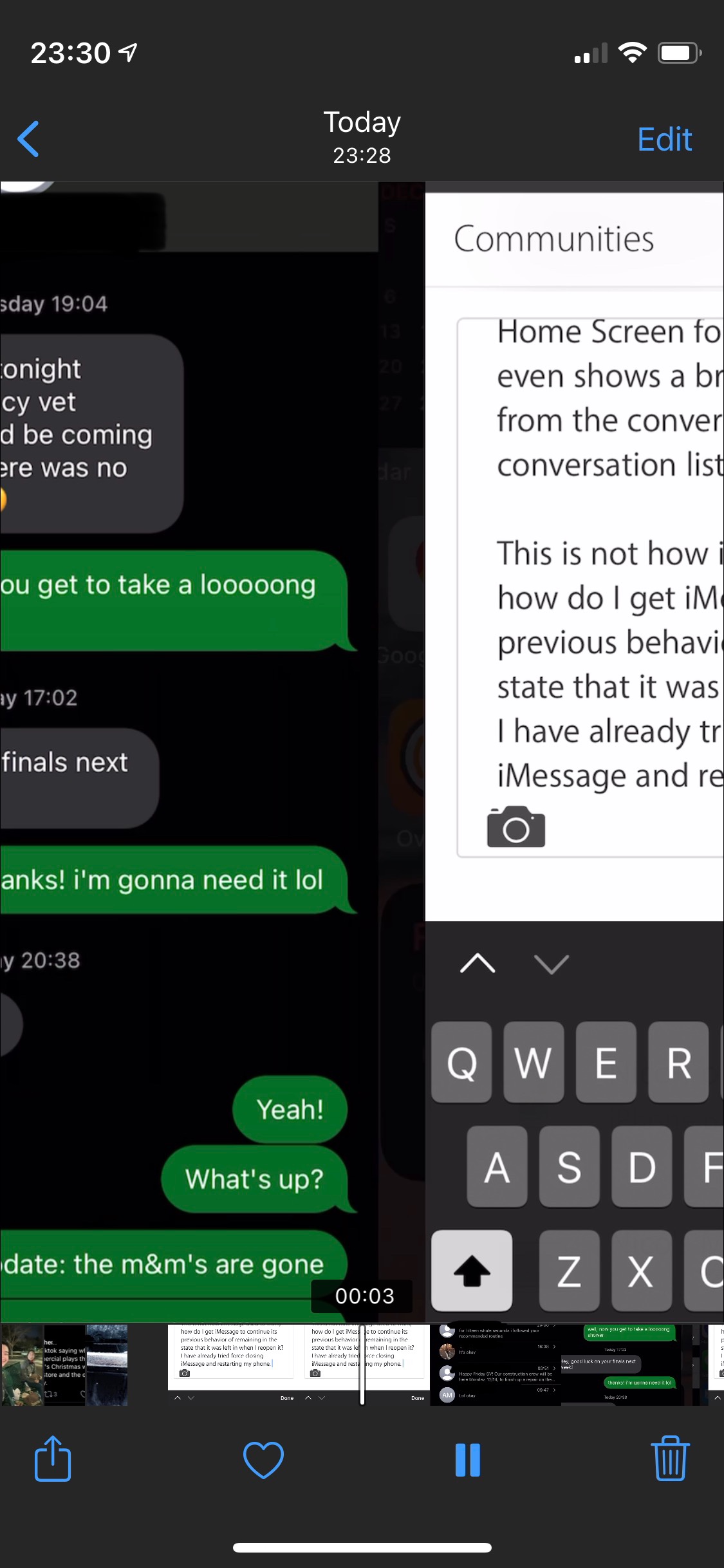 Because I cannot attach a screen recording, I’ve attached screenshots of a screen recording I have made demonstrating this issue. Using the home bar at the bottom of the screen to open the previously opened app, I open iMessage to a conversation that I was previously in. Before the app switching animation can finish, iMessage begins a screen transition from the conversation I wish to return to back to the conversation list. Before I can tap on anything, I’m frustratingly left looking at the conversation list instead of the conversation I wanted to return to.
