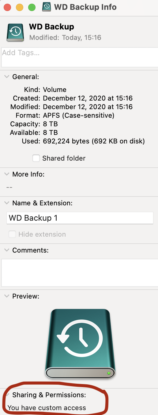 - Within a minute or two disk permissions changed to "you have custom access" with no ability to select read-write