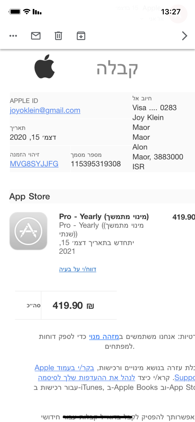 Hi, my daughter asked me to download app and she payed 419.90₪ for a year! I I canceled the subscription. Please bring me my