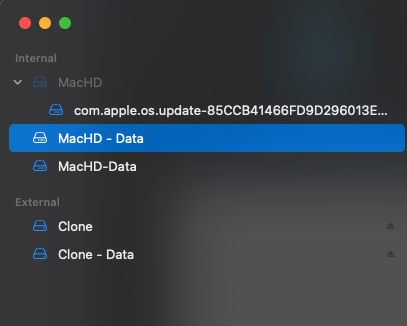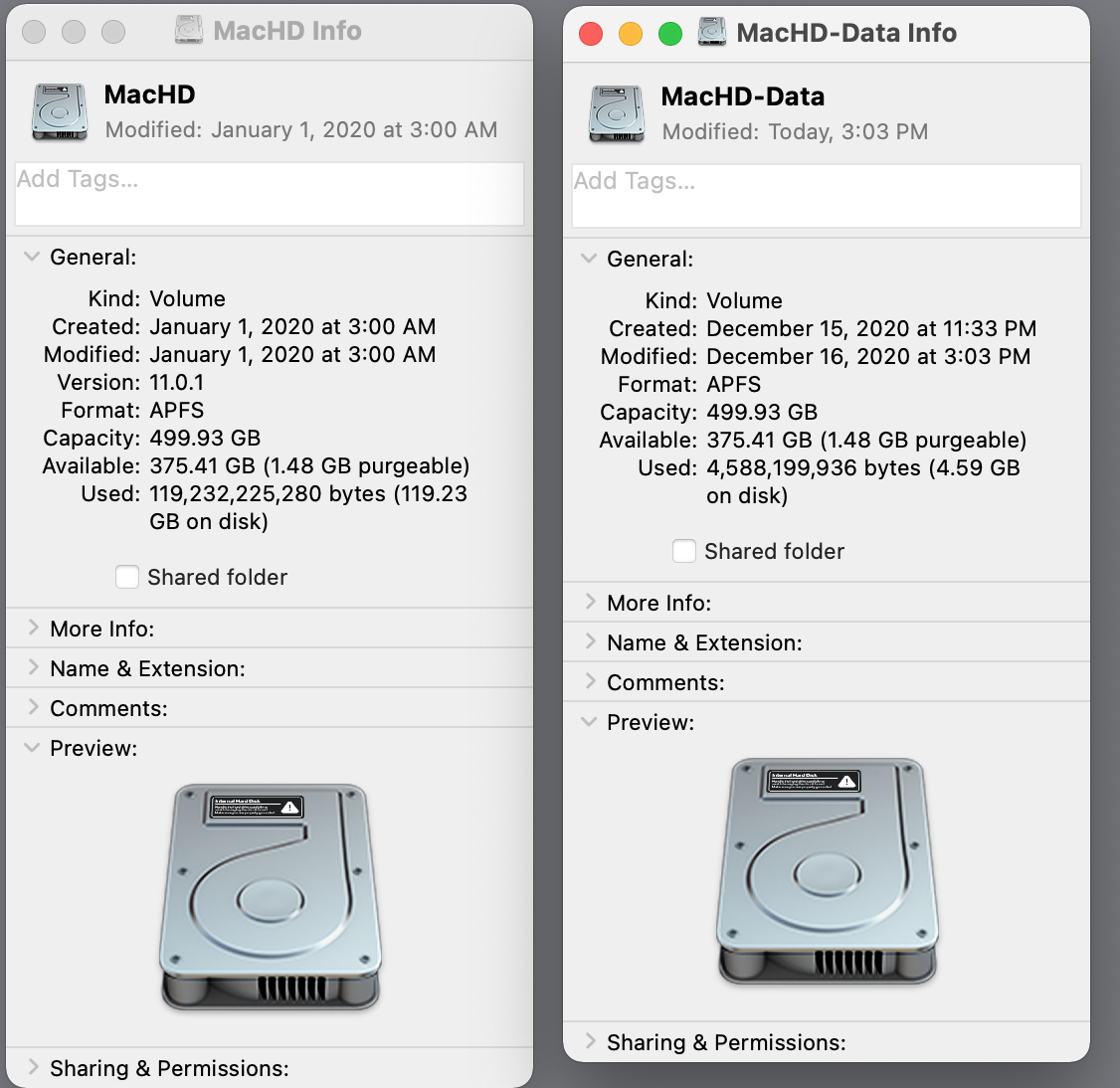 I formatted my 500 GB SSD with APFS in Big Sur, and I have, as expected, MacHD and MacHD-Data (I shortened the names).