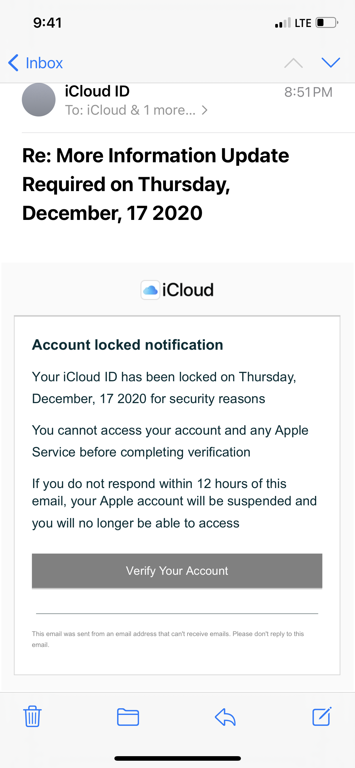 Do not reply to that. It is a scam. If there was a problem you would be notified when attempting to log in, including when logging into this forum. Also see: Recognize and avoid phishing messages, phony support calls, and other scams - Apple Support