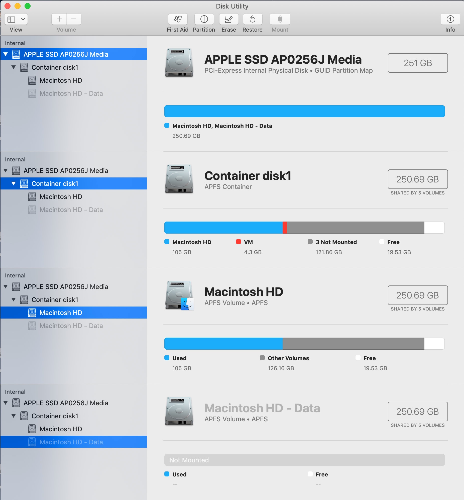Hi, my wife's MacBook Air 2017 Mojave has a mysteriously filled up hard drive. A large portion of the HD is taken up by additional, unmounted partitions though the main suspect is the "HD - Data" partition.