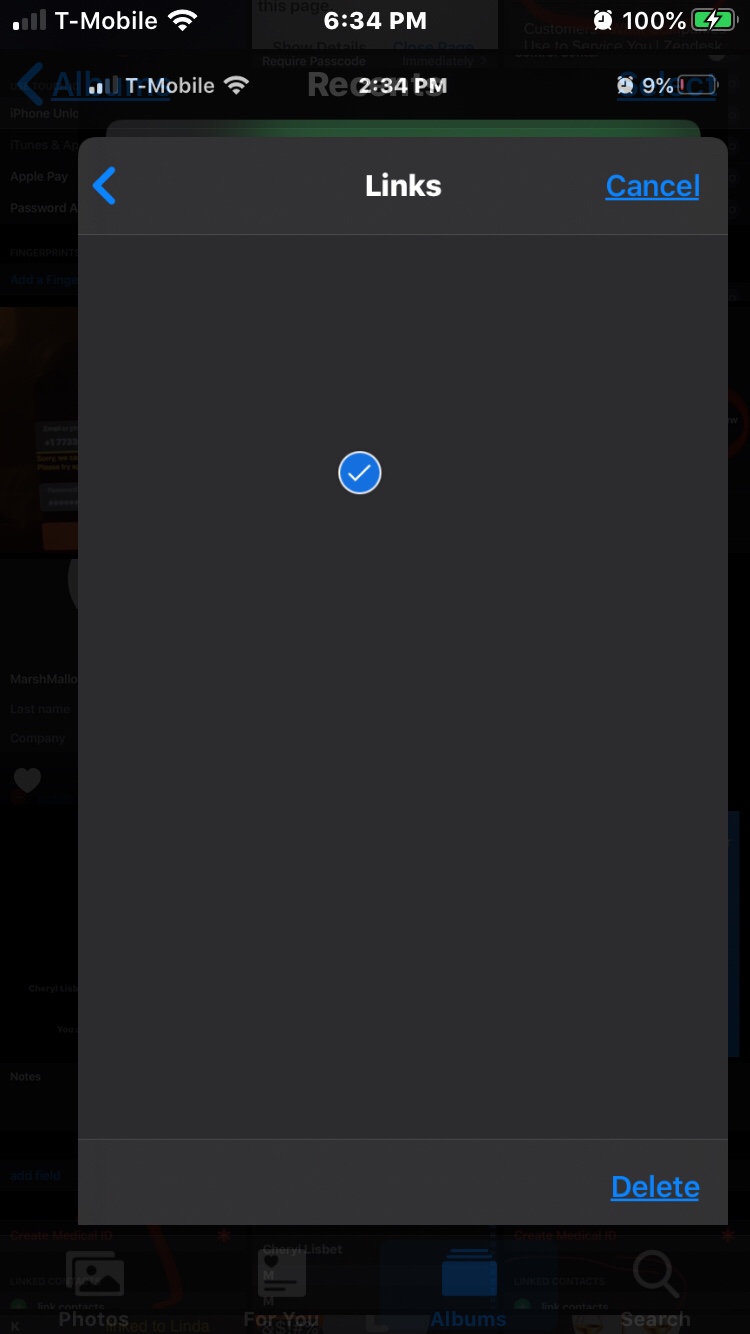 One contact I barely know—she used to be a downstairs neighbor.  Pure chance allowed me to discover that her contact info included a link to someone or something.   Out of curiosity, I tapped on  the “linked contact” field and was brought to a completely blank screen except for a red “delete” option at the bottom right corner of the screen.   Other than that, the screen was a perfect blank.  I wanted to see what I was about to delete before I deleted it, so I started tapping all over the screen, waiting for something to happen.   It did—a red check appeared around the center of the blank screen, but whatever was next to it remained hidden.  I realized that this link had to have been been coded by someone in order remain invisible to me.   I’d simply managed to  tap on the nvisible interactive field on my  blank screen which lit it up with a red check mark.   Immediately a system alert appeared asking  me to confirm the delete if something I couldn’t even see.  I realized that the hidden link could be anything—a contact name, a telephone number, even a website.  So I took a screenshot and clicked delete.  I thought that was the end of it.