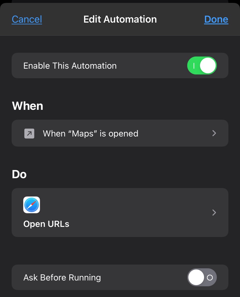 With the Shortcuts app it seems like you would be able to set a string of actions to take place upon use of a certain app. For this one in particular, I’d like for my location services (Settings>Privacy>Location Services>On/Off) to be toggled when I start the Maps application. Is this possible to do and, preferably, make reversible so that when i close Maps my Location Services are toggled back into the ‘off’ state?