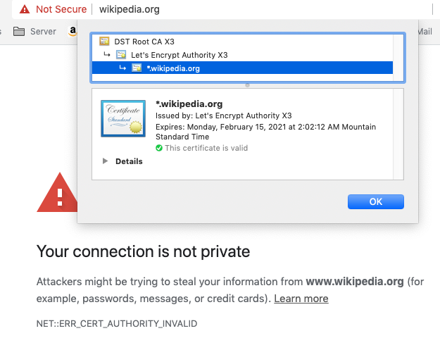 NET::ERR_CERT_INVALID in Chrome, Safari for certificates that ARE valid. Reboot fixes the issue for 24 hrs and then situation persists. Specifically certificates from DST Root CA X3 chain are affected. I have deleted any expired Root Certs that I hoped were the issue but the problem persists. Present in all user accounts.