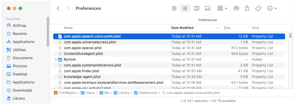 Then in Preferences, rename com.apple.speech.voice.prefs.plist to com.apple.speech.voice.prefs.plist_old