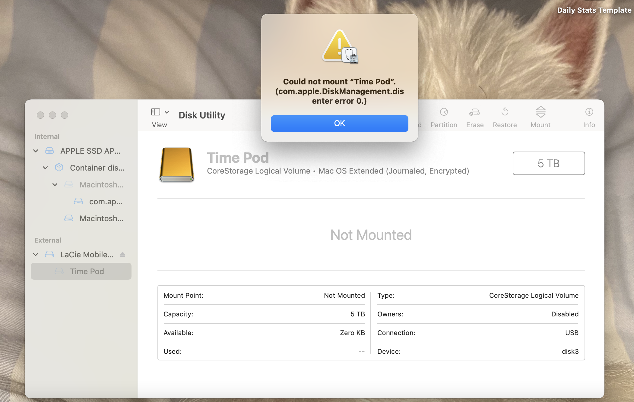 Does anyone have any idea what is happening here, please, and how I can get my external drive mounted to do a backup?