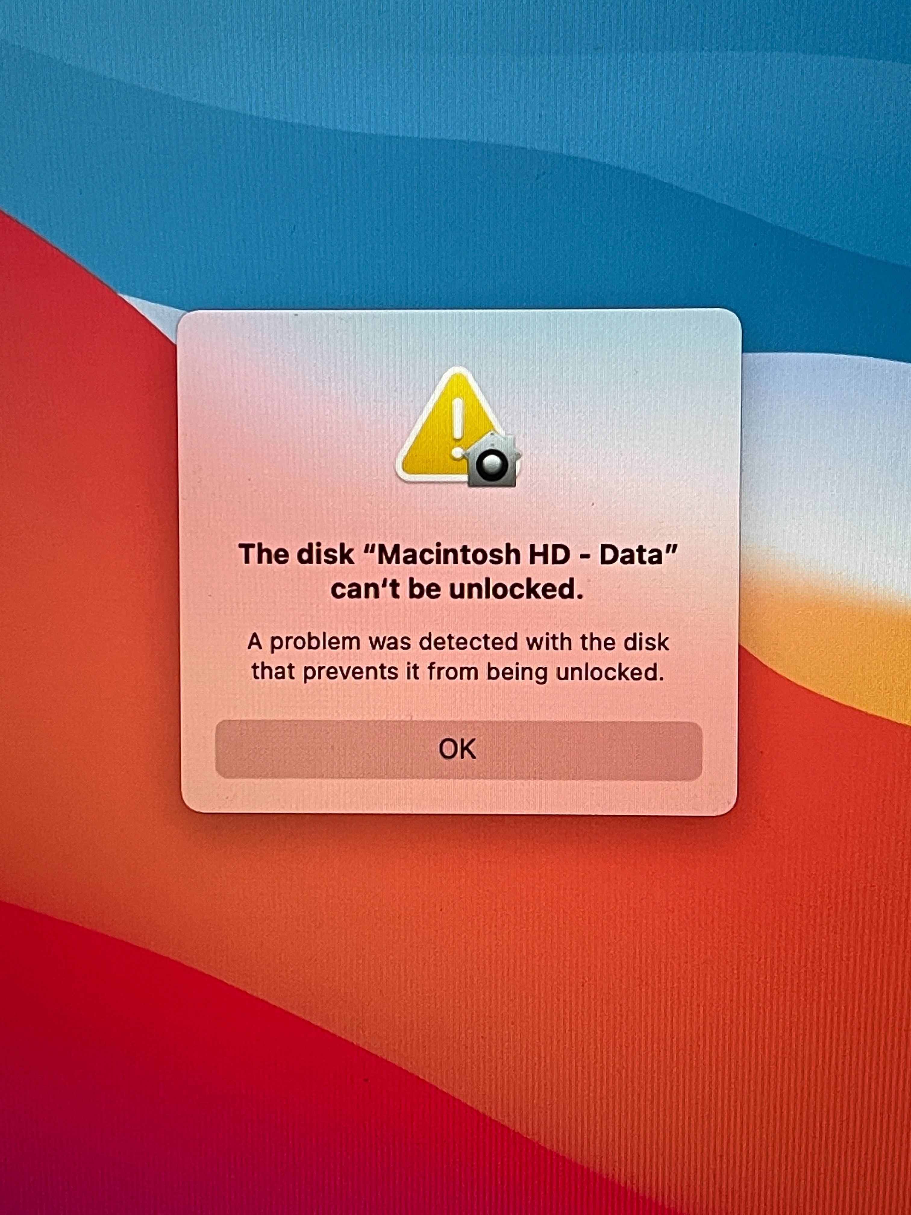I updated my macos from catlina to big sure and when i start my macbook show me a massege on my mac say your hard is locked so i go to disk utility to do first aid on Macintosh hd but it is stay on unlocking disk so should i waiting unlock the disk or i must format the hard disk ?