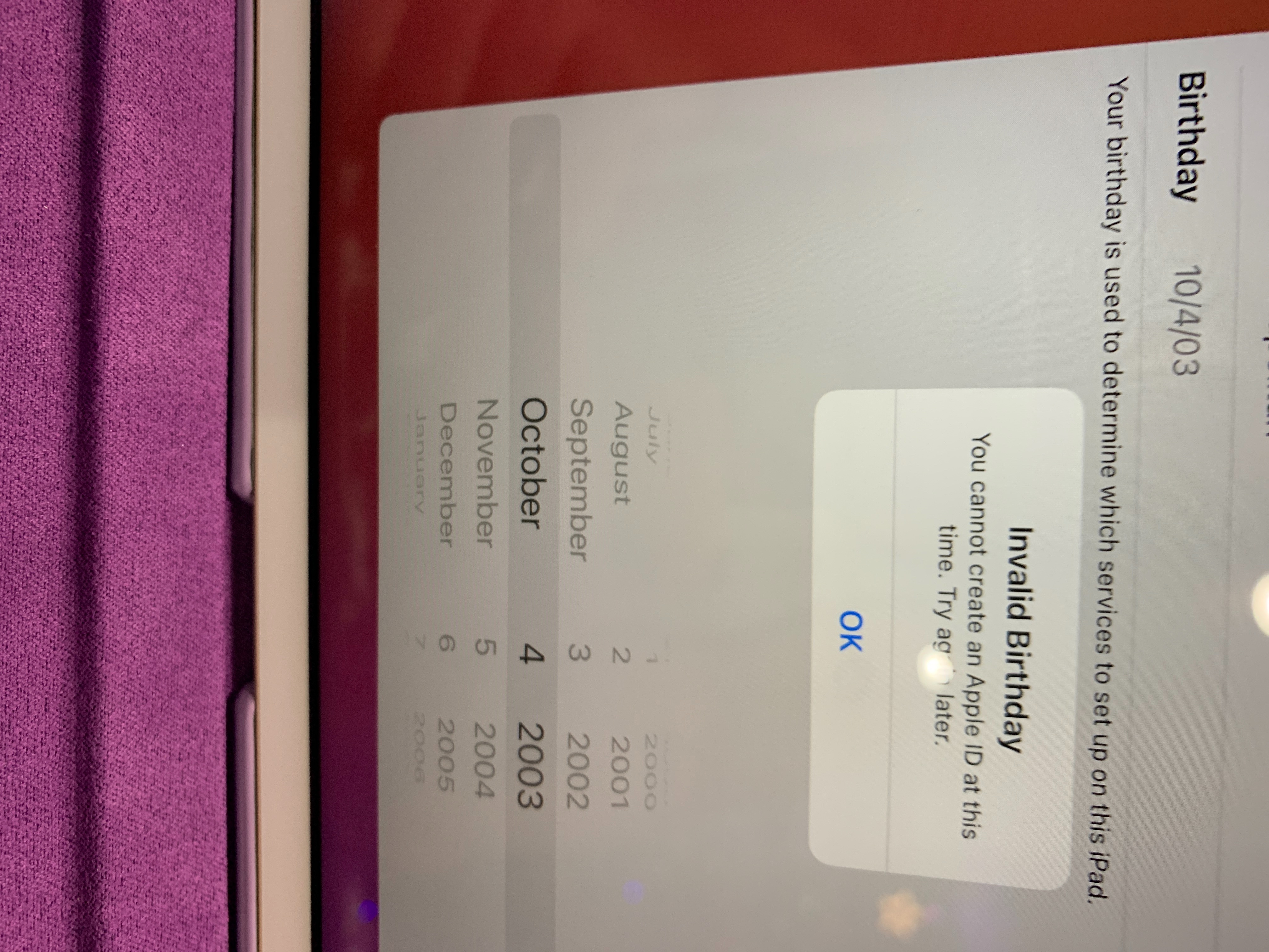 Hi.. I am Setting up a new Apple ID for my daughter and the iPad is saying invalid birthday, 10/4/2003??