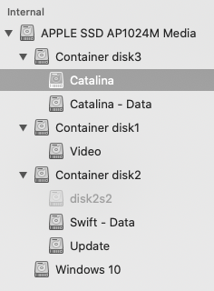 Catalina (I've given that partition the same name as the OS) is what I'm currently booted to. "Update" is how any Big Sur drive appears in Catalina or older. But let's pretend it's another installation of Catalina.