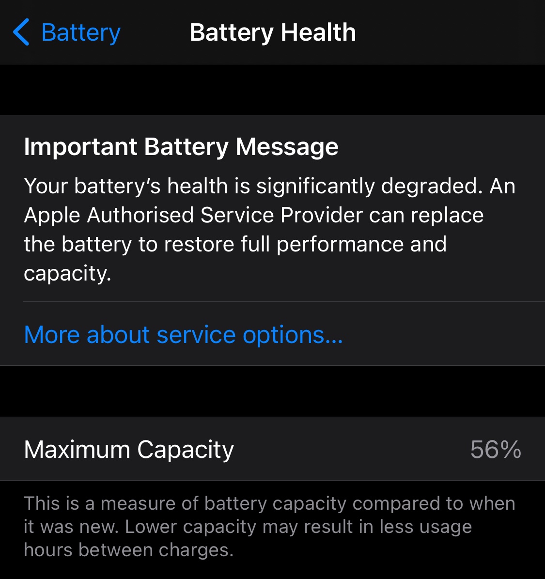 my iphone xs maximum battery capacity is only 56% im guessing this is bad and will need to replace the battery to fix the issue