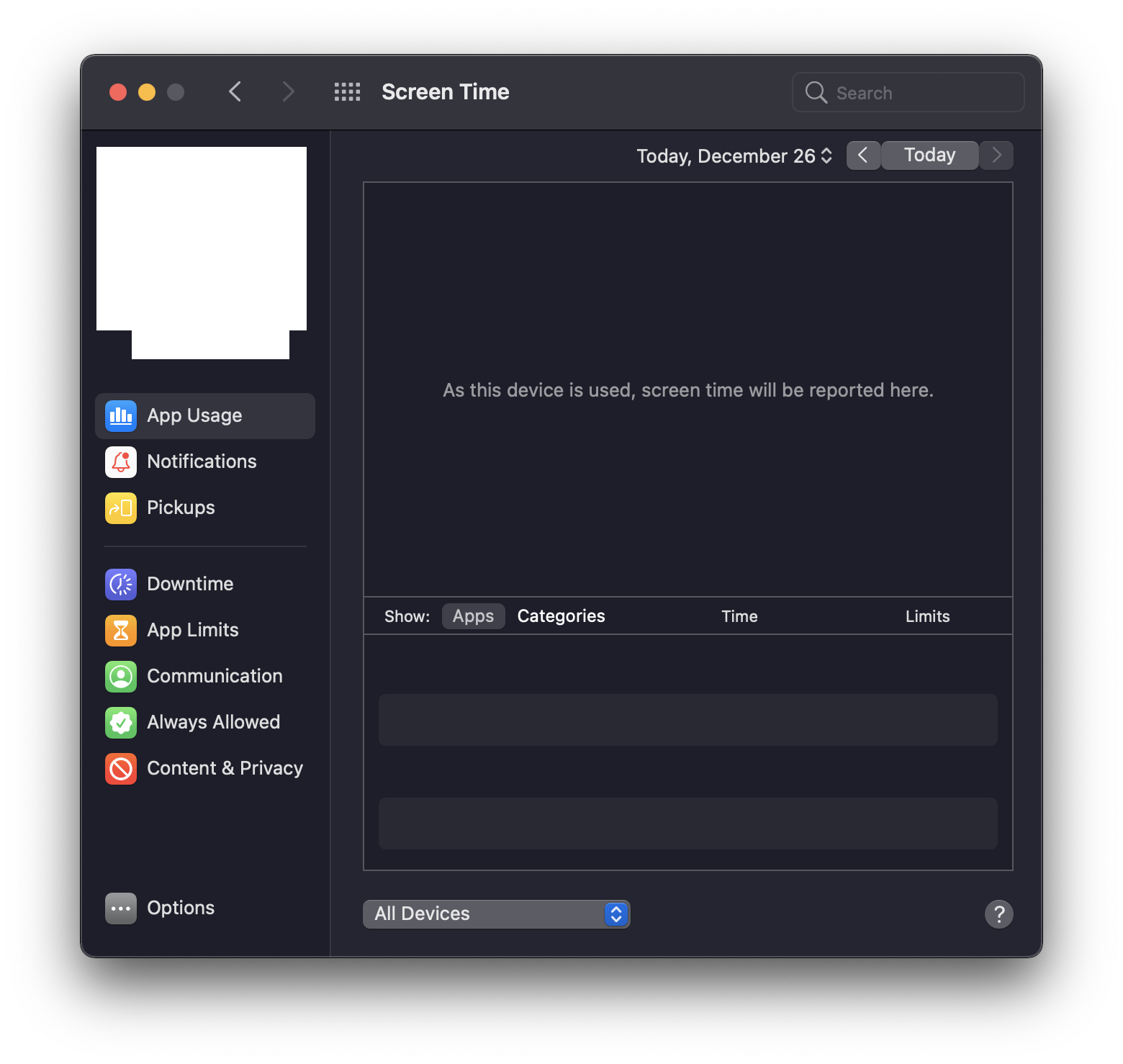 "Screen time usage not loading: Hi all, I have screen time enabled on all of my devices (iPhone 7, iMac+MBP). However, I do not see any usage in the screen time menu for any/all of these devices."