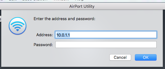 This is taken from a reset airport which will always return to home IP of 10.0.1.1 and no password.. In your case you need to use the actual IP and password.