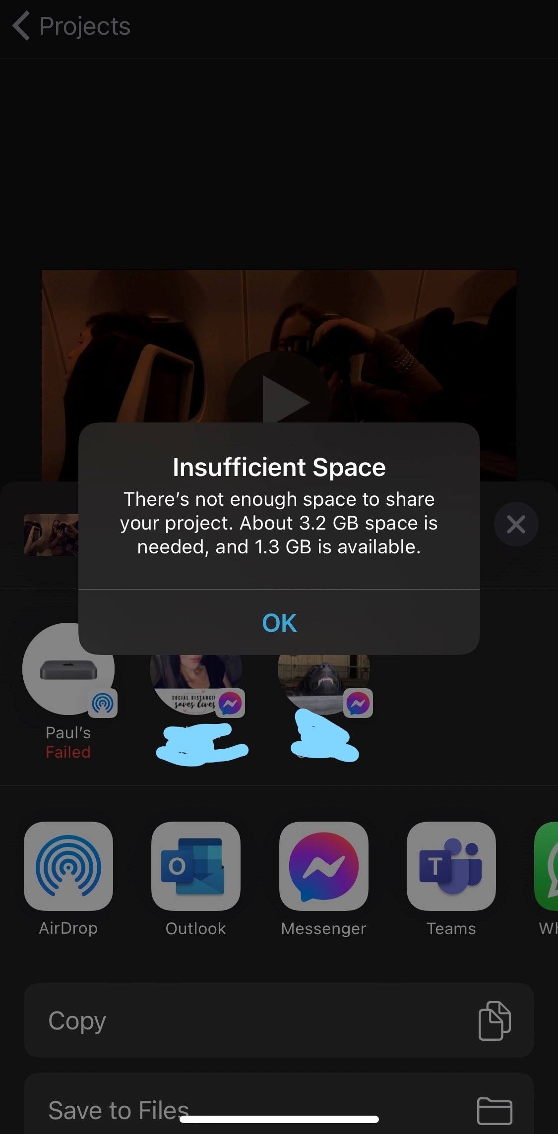 It doesn't seem to matter where I try to export the file to (airdrop, save to files, onedrive, icloud) the error is the same. The message is implying that my phone doesn't have enough space. I have 64 GB available on my phone right now (see attached picture) so I can't understand why I'm receiving this error. Is there a cashe that is full so it's referring to temp space instead of permanent, like it doesn't have enough temp storage to box up this file and ship it off? I have never had another space shortage issue/notification on this phone in the months since this imovie error started. I have tried exporting smaller imovie projects over airdrop and they work... I'm hoping someone has an idea that might help me out so I can FINALLY finish my movie project on my mac.