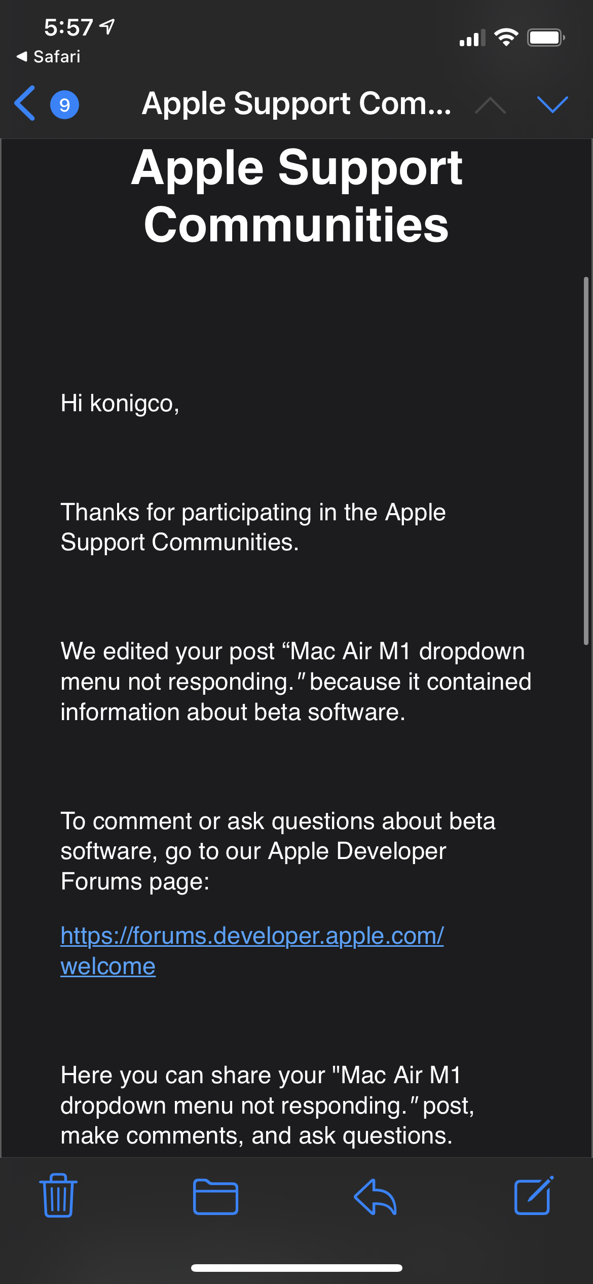 Mac air m1 dropdown menus not working ... safari, finder, or any application, nothing happens when you click on any menu item at the top of the screen... applications work fine, but you can’t use the dropdown menus. Running one external monitor. The problem goes away with a restart. Hoping this is not a recurring problem... wondering if anybody else is experiencing this issue?