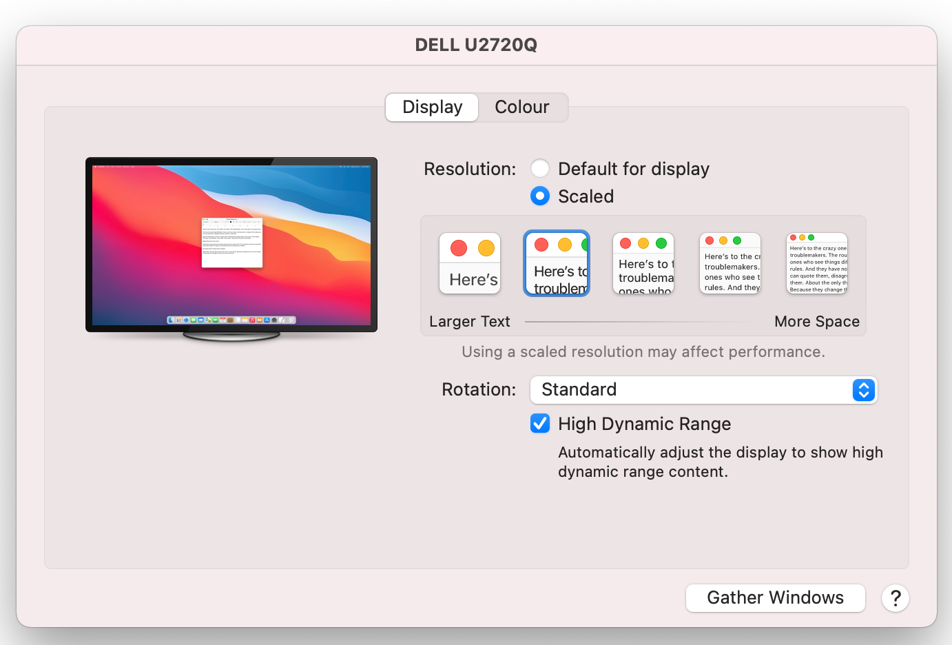 I have a Dell U2720Q external monitor (it is a 4k monitor that supports HDR10) connected to my 2019 16inch Macbook Pro (with AMB Radeon Pro 5500M 8gb graphics card).