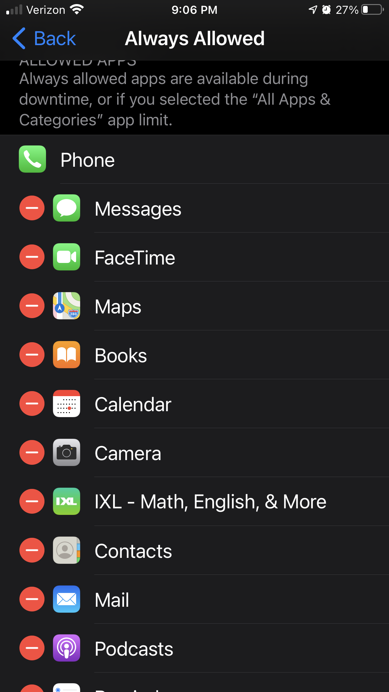 - App Limits: Are there any apps, categories, or websites selected in App Limits? If so, which ones? Tap the arrow in each category to reveal the specific apps in the category. For example, if you have Social selected here, you may need to go into the submenu and make sure you don't have FaceTime blocked.