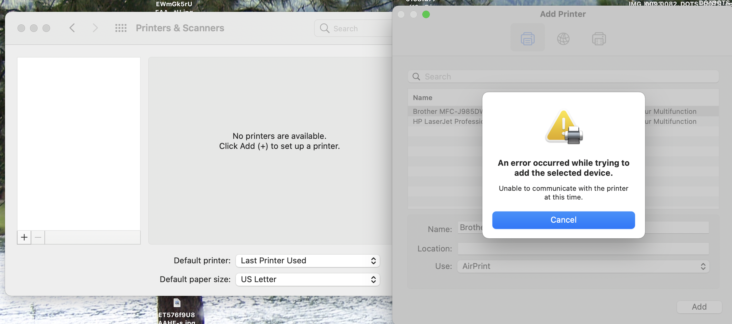 I bought a new Macbook Air for my wife for Christmas, upgrading her old one which was running Sierra. The new machine is loaded with Big Sur and cannot communicate with either of our printers. (My own laptop, running Mojave, connects fine.) The Brother printer (MFC-J985DW) is listed by Apple as Airprint compatible. I reset the printer app on the new Macbook, removing all printers from the list, and then hit "add printer". Both printers (the Brother and the other HP printer) both showed up on the printer interface. (So the Wi-Fi network works.) I selected the Brother printer, and the "use" box came up with AirPrint. I hit "add" and a notice comes up: "An error occurred while trying to add the selected device. Unable to communicate with the printer at this time." The same thing happens with the HP printer. I tried connecting with the USB cable, but the Airprint option no longer shows up and it asks for a driver. (There is no Brother driver for Big Sur ... the company says to use AirPrint.) So I can't set it up using USB. What to do?