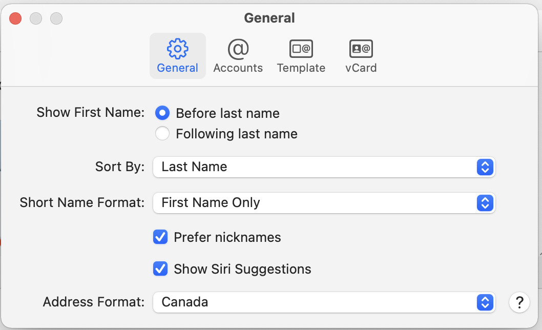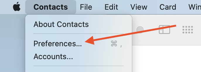 Thanks, Brian, appreciate your response. I see that the screen shot I took came through blank. Actually, I did check out the Apple Support article before I wrote for help on this forum. That's where I learned to click on Preferences in Contacts. When I click on my Contacts app and the window appears, there is no option to click on Preferences. In the left hand column I see: All Contacts, iCloud (greyed out), All Contacts, iCloud, Travel Buddies (I created on another device), On my Mac (greyed out), All on my Mac. In the next column: Search Contacts and the beginning of the list of contacts. In the right column is my first contact information. At the bottom of that window is +, Edit, and share contact icon. That's it. No Preferences option.