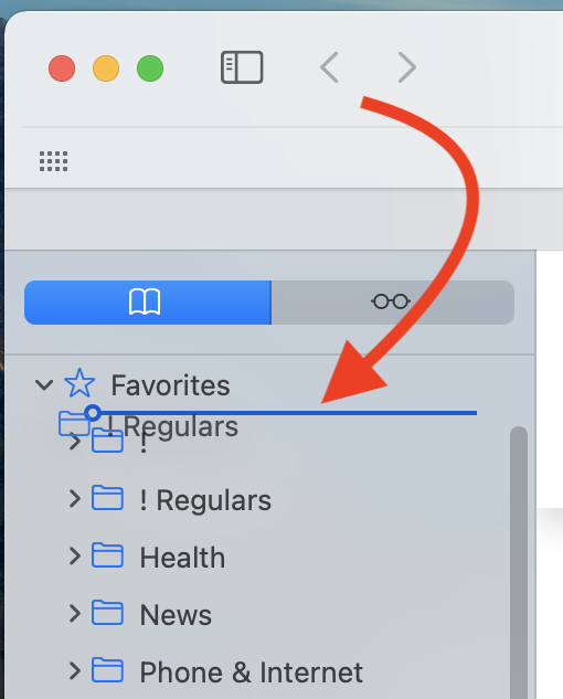 I recently imported all my bookmarks (successfully) into Safari for my Macbook Air. However the "favorites" were re-ordered during the import and I want to put them in the previous order. However, drag-and-drop does not work in the favorites sidebar for me, even though "people say" that I should be able to do that. I have "drag enabled" for the trackpad. How can I reorder?