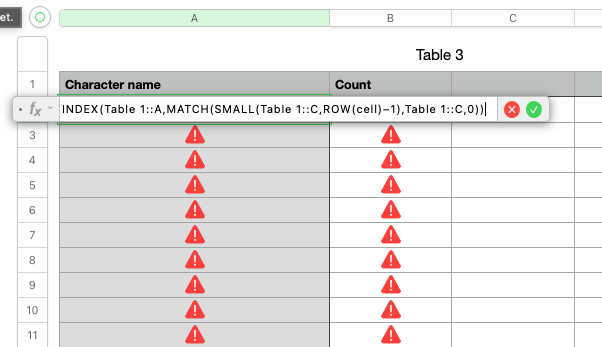 The first table formula is perfect (and yes, I'm doing a Star Wars character spreadsheet - nerd alert). It's just something isn't lining up for me on the second.