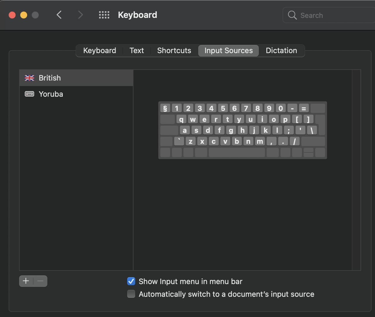 Hi, I have recently found an input source that allows me to type characters in Yoruba which aren't available natively. I have added this input source to the "Keyboard Layout" folder and have added it to the list of input sources in Preferences > Keyboard > Input Sources, also on this page the box saying "Automatically switch to a document's input source" is unchecked as seen in the attached photo below.