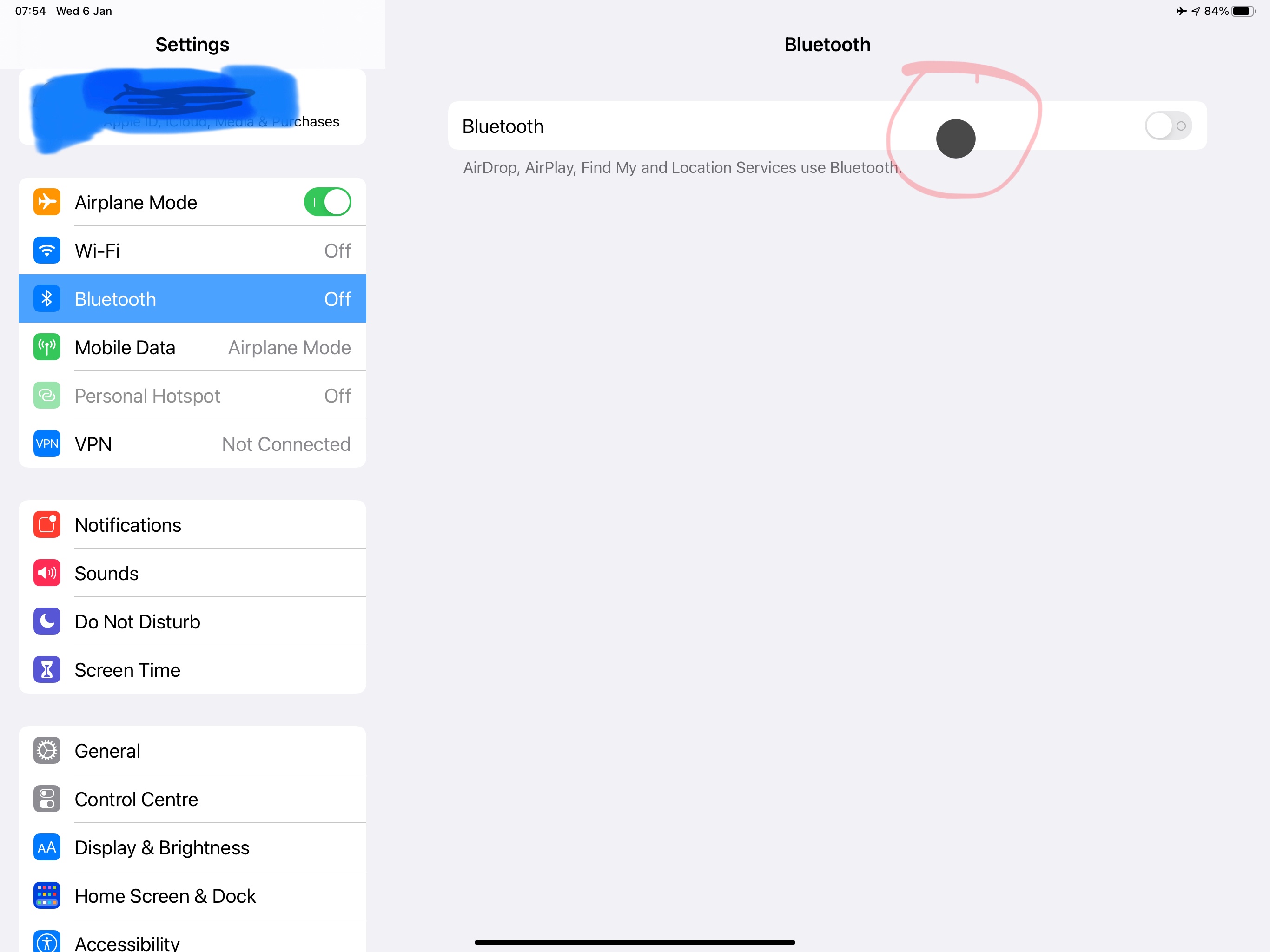 I have no idea where this small circle of about half-a-centimetre comes from. It is not a pixel failure because it rotates to a different position when I rotate the screen. When looking for a solution I read that it might be connected to a wireless mouse or to the “Dwell” function. I have no mouse attached. (Never) and I have no idea what “Dwell” is.