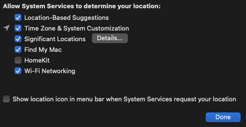 Do you have Location Services configured in System Preferences : Security & Privacy panel's Privacy pane to Enable Location Services? If you scroll down in that list of Location services, you will encounter System Services with a Details… button. With the Enable Location Services selected, click on that System Services Details… button. Mine looks like this: