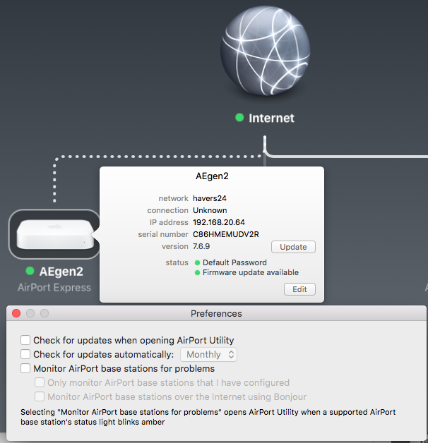 You can also turn off checking for new firmware.. or on if you happened to turn it off.. that allow the Airport Utility to check apple servers for the latest and occasionally greatest but sometime worse firmware.