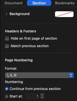 I have successfully splitted the document in two sections, so that it counts from 1 to 6, and then from 1 to 11 (after page 6). I am writing an academic paper, and would like to have my preface numbered with roman numerals, but when I try to change the format of the numbers in the first section, the numbers in the other section also become roman. Is it possible to have two different number types in the same document? In the page numbers in the bottom.