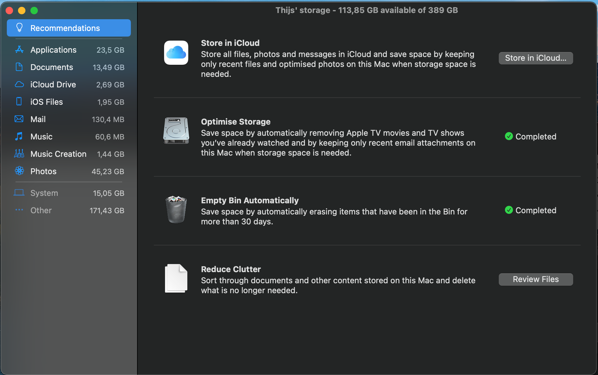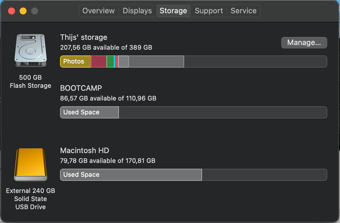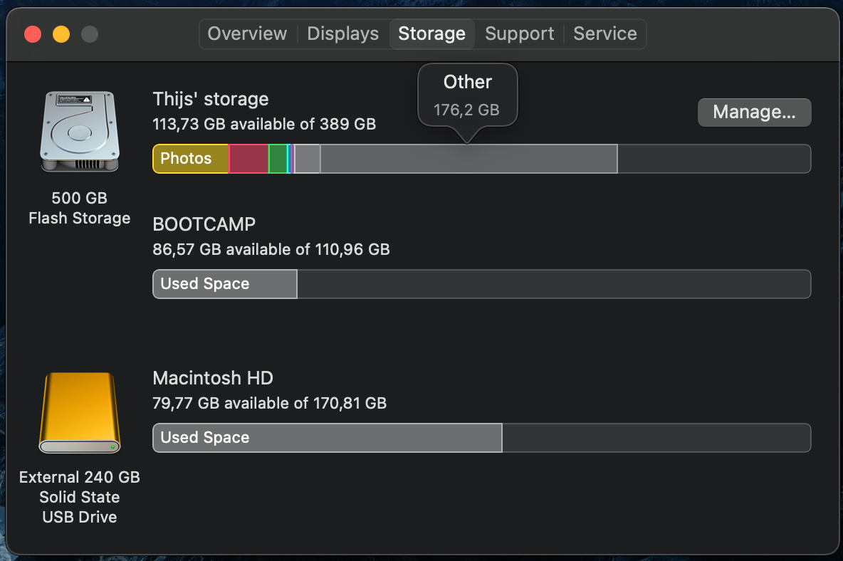 Hey, I was wondering why I have 176,2 GB of 'other' storage on my Mac. I don't think it was this big in Catalina or any of the other updates. I have no idea what might have changed. Is there a way to delete some of this stuff? I already tried a few apps like CleanMyMac X (which works really good btw). I just started using Boot Camp and realised 500 GB might not be enough. I got the SSD outside of my old Mac and (with an adapter) plugged it into my 'new' Mac. Then I put a lot of movies and stuff I don't really need onto the old SSD. My Boot Camp partition is now a little bit too small, but I would still like to have at least 100 GB of free space on my Mac partition, so I can still do whatever I want. I already transferred most of my files (as you can see below), but I have no idea how I can delete some of the 'other' space.