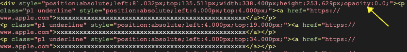 The HTML content found in page-1.xhtml of the exported EPUB appears as the following, where the yellow arrow points to the term "opacity:0.0;" that I added to suppress the rows of "#" characters within the DIV box. Afterward, the hyperlinks remain functional over the image in the EPUB.