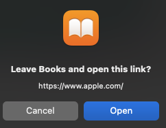 When you do click the cleaned up, hyperlinked image in the EPUB when opened in Books, it will challenge you to complete the link with the following dialog, and selecting Open then does so in the default browser.