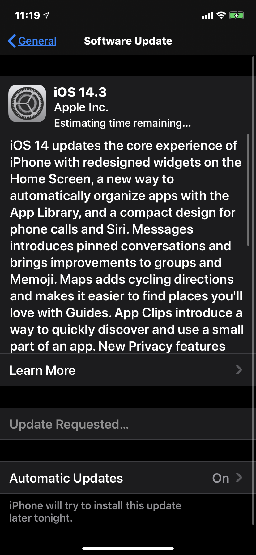 Why does my update button in settings say “Update requested”? My phones the 11 and I just got it recently but it came not updated.