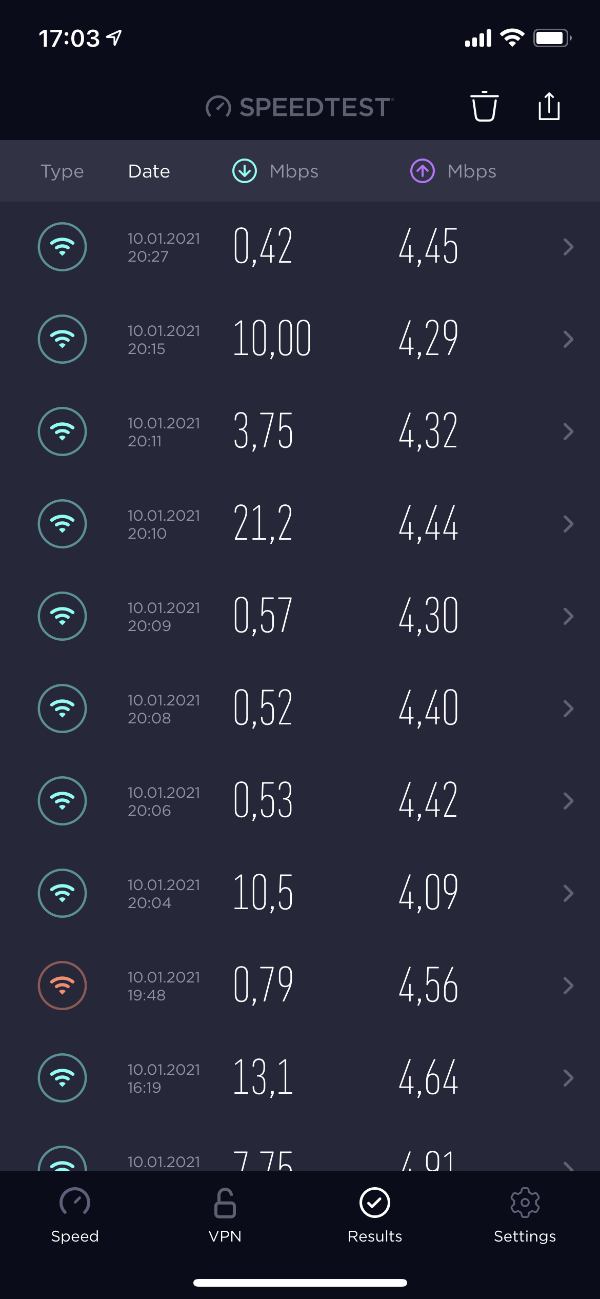 While all my devices can get 100mbit, the iPhone 12 Pro connects on average 0.50 mbit. Appears to be connected but not connected.