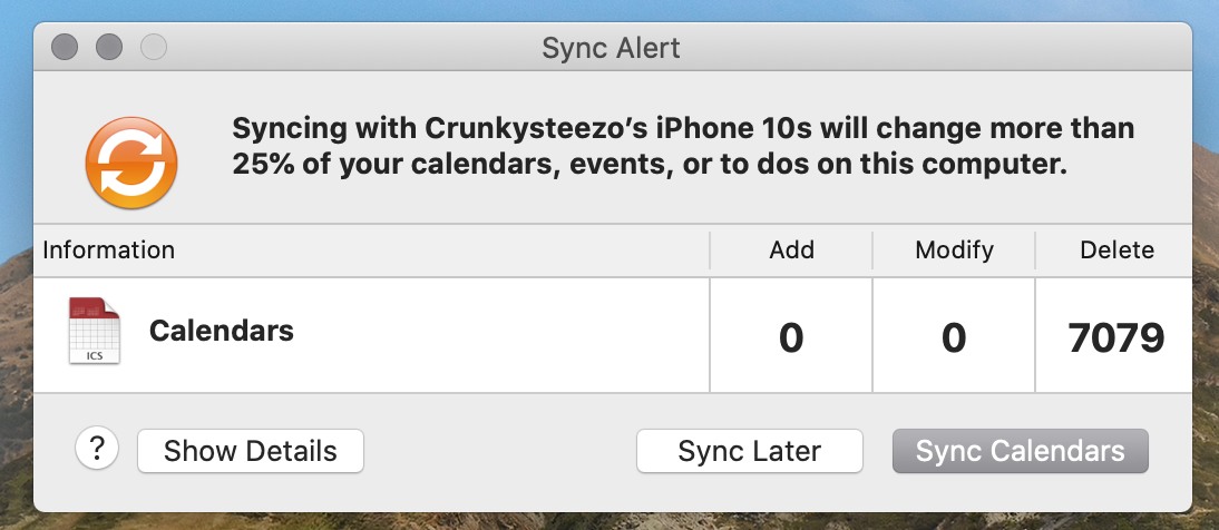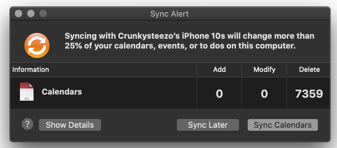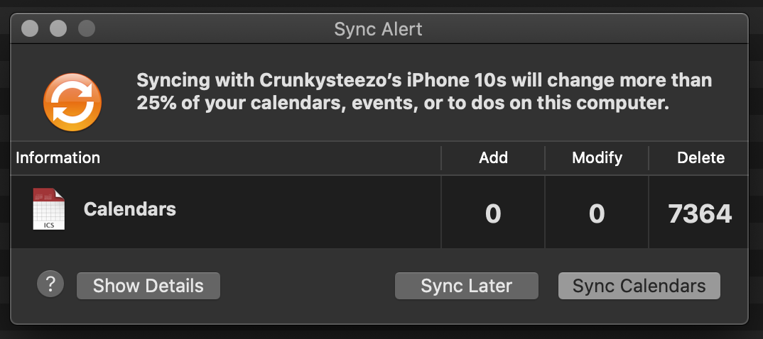 To be clear my calendar's events are syncing up just fine, if I add one on my iPhone or mac it goes on the other device and any changes made show up on both, so this alert is incorrect, but something is prompting it when I plug in my phone to charge it. It has something to do with charging my phone.