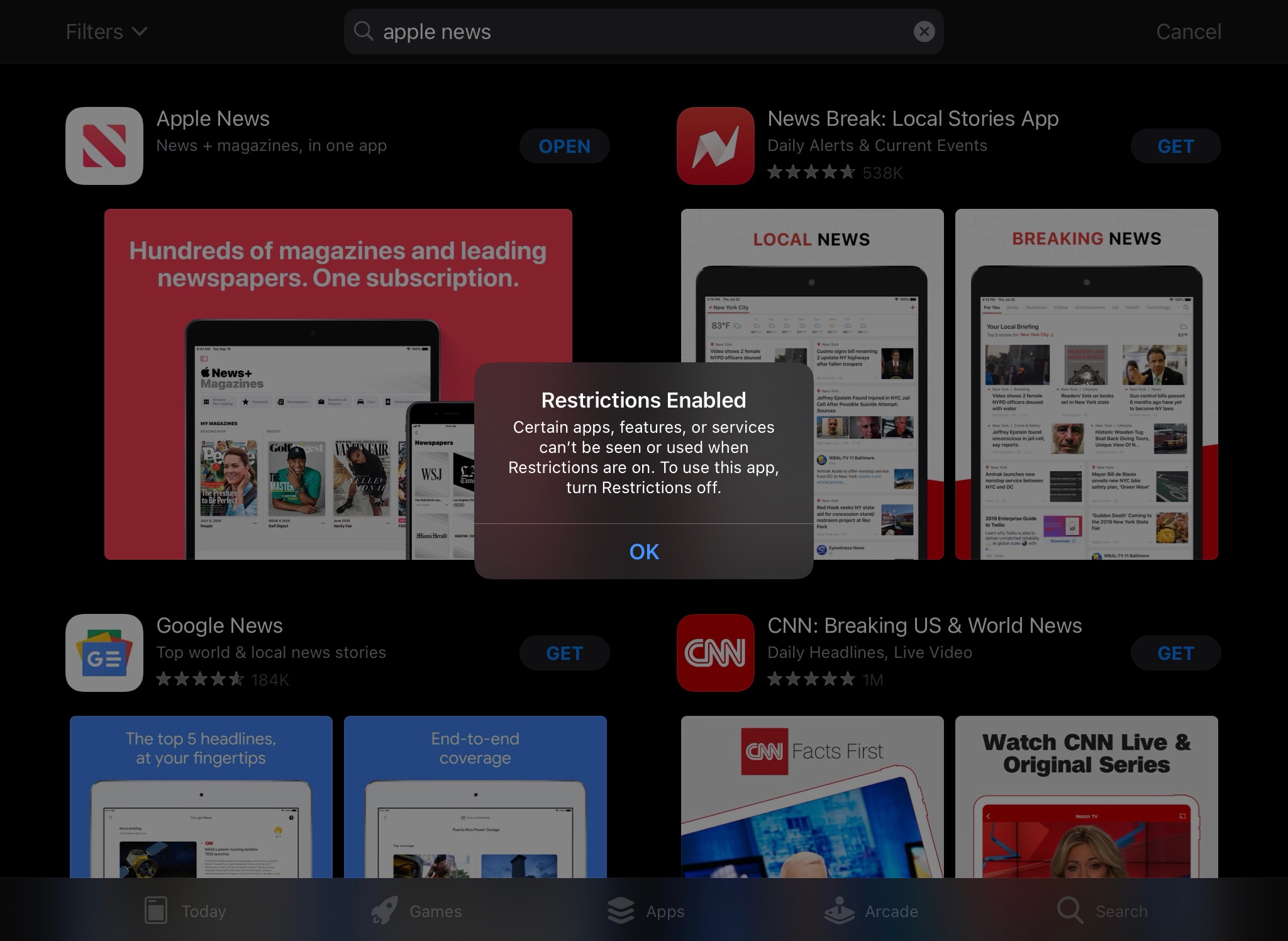 I am trying to use Apple News but it is not showing up in my Home Screen. It doesn’t even come up when I swipe down to search for it, and when I click “OPEN” in the App Store, it gives me this message: