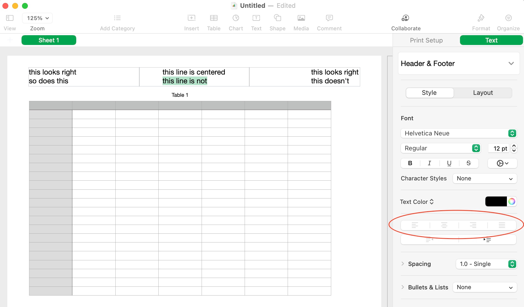 Hello, Numbers gurus. I'm having trouble aligning text in a page header. By default, text entered in the center portion of the page header is centered. So far, so good. However, when I add a second line that line is left-aligned directly below the left edge of the first line of text. I want the second line also to be centered but no matter what text I select, the alignment icons in the Text inspector are grayed out. See the screenshot below. Something similar happens when I add more than one line of text in the righthand portion of the page header; only the first line is right-aligned. Help!