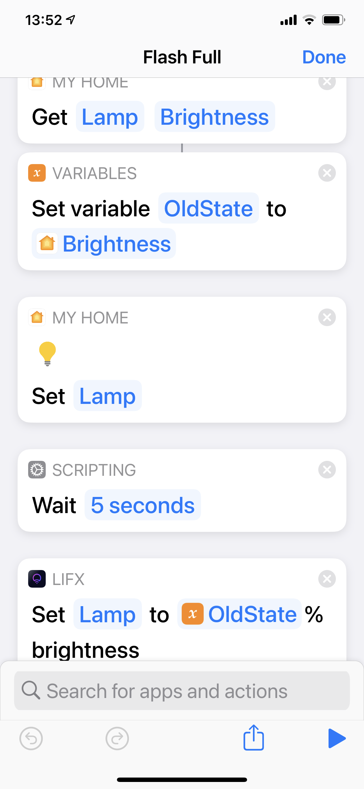 With a HomeKit automation, if I use Turn Off after x minutes command, what happens at end of x minutes? Does decide return to previous state or actually turn off? The example: I have a light on 30% brightness. When a motion sensor sees someone, the light should go on 100%. Then with “Turn Off” I want the light to revert to 30% after the motion. NOT switch off completely. Any ideas what the system would do?