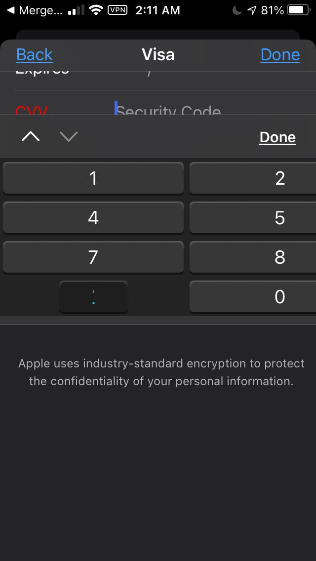 I have never had this issue. For some reason, I couldn't make an app store purchase and had to reenter all my credit card info. No big deal. But when I tried to make an in-app purchase, I got a pop up saying I had to verify the "new" card. The attached screenshot is the page I got. As you can see, a full third of the keypad (including the delete button) is fully obscured. I cannot turn the phone horizontally to rectify (I tried) as nothing changes.