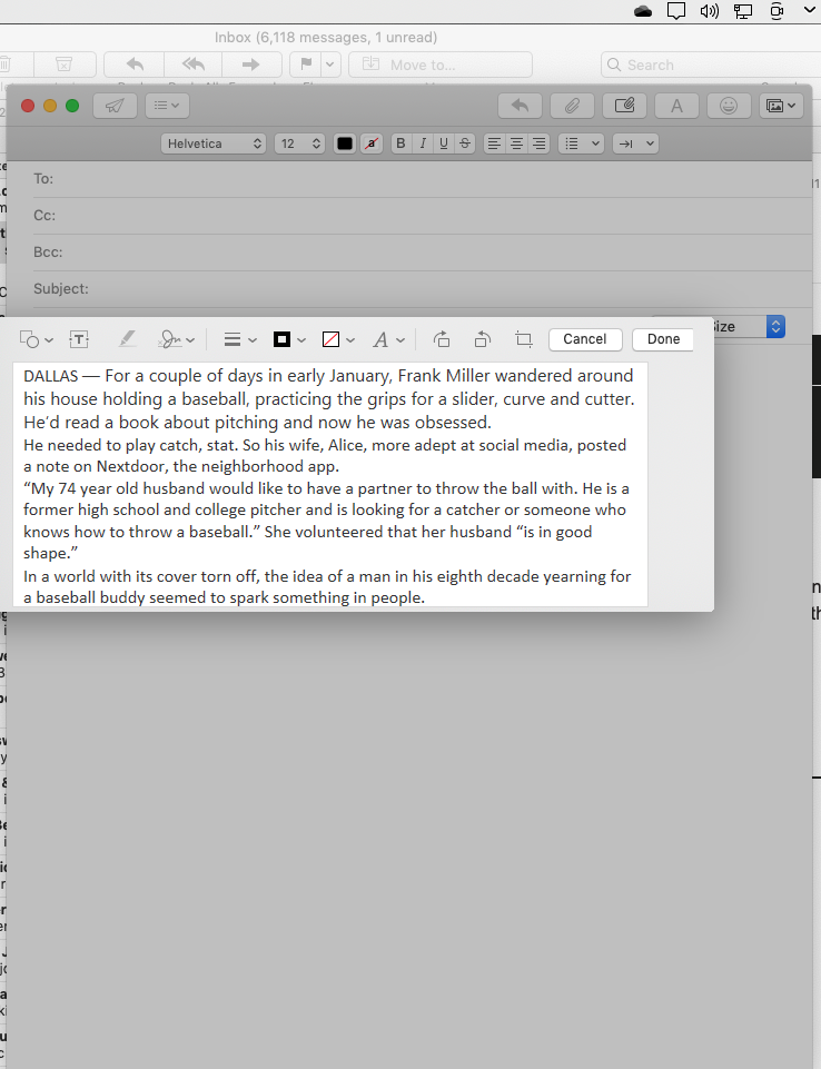Images are attached below. In first image you can see the box around the text and the down arrow that calls up Mac image editing tools. In the second image you can see what happens when I click the down arrow.