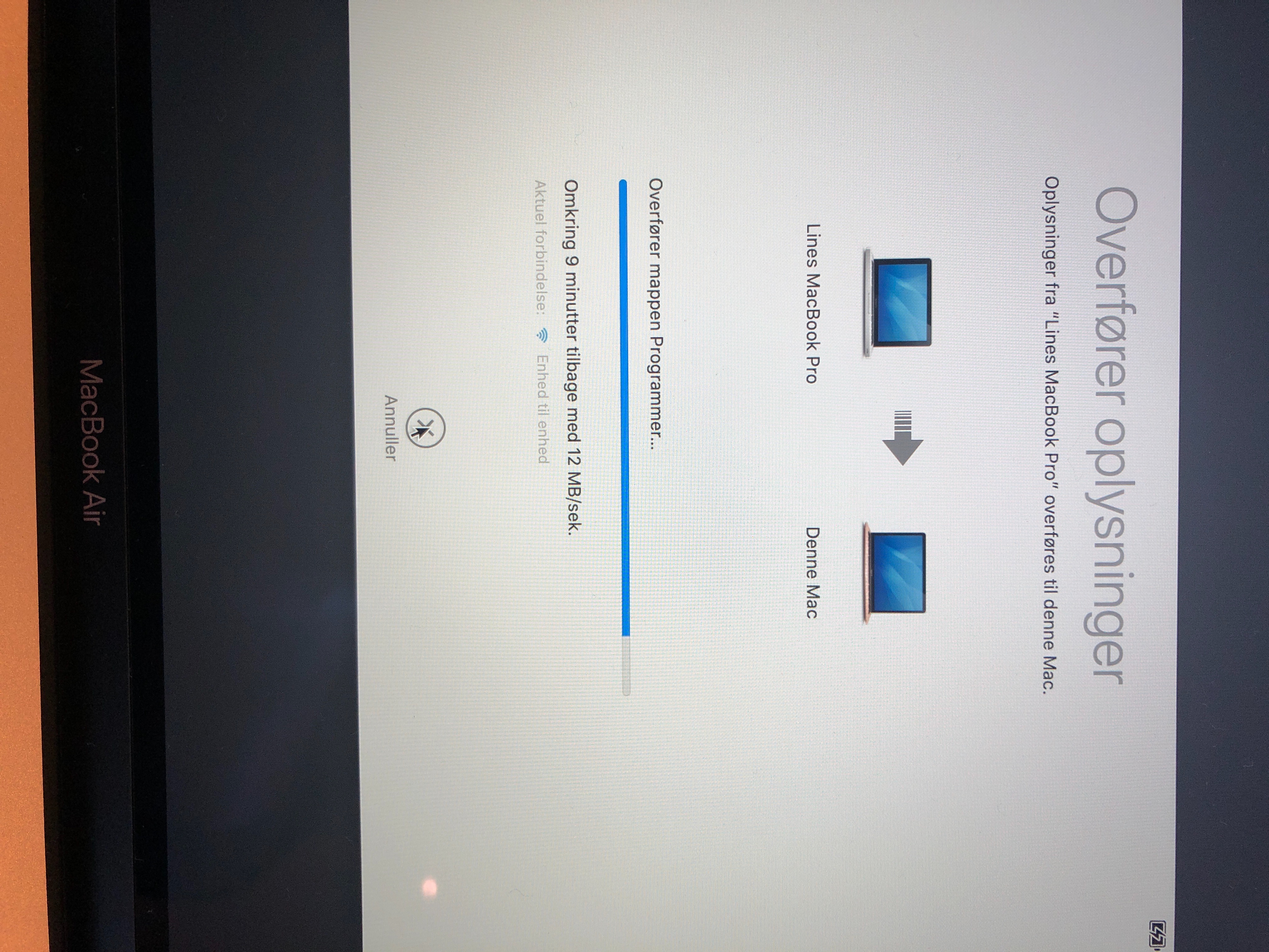 I’m trying to transfer data from my old MacBook pro to my new MacBook Air and it has Bern standing like this whit 9 minuts back for the last 12 hours.. Do I cancel or do I just have to wait?